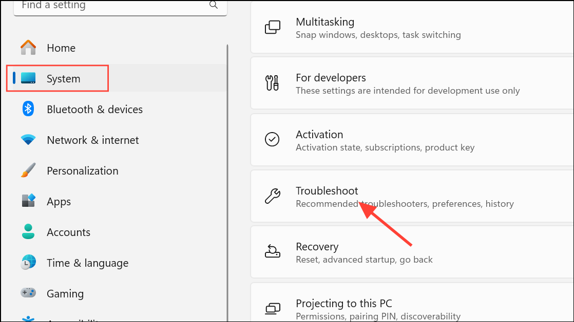 Step 1: Click the Start menu and select Settings. Navigate to System and then choose Troubleshoot.