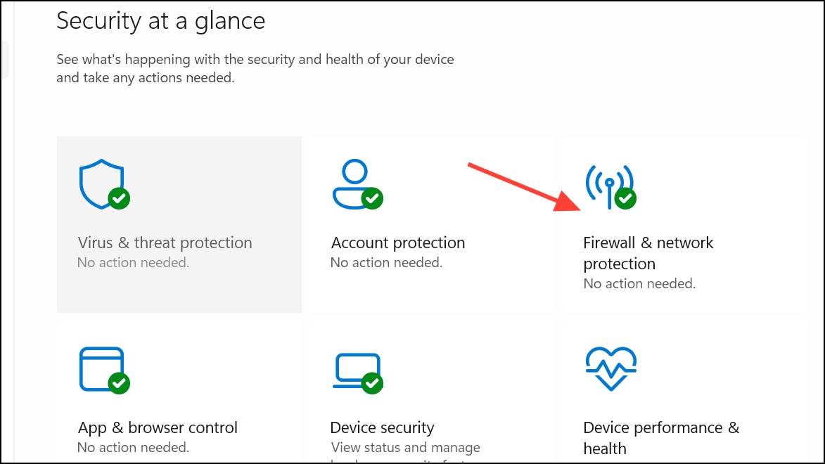 Step 1: Open Windows Security by clicking the shield icon in the taskbar or searching for it in the Start menu. Select Firewall & network protection.