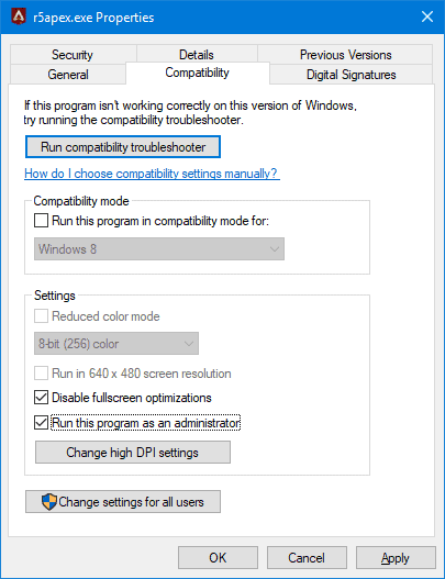 - Right-click on r5apex.exe file, and select Properties from the context menu.