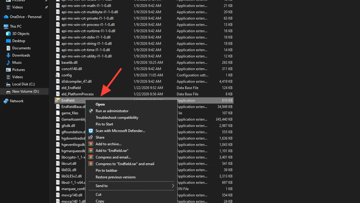 Step 2: Inside the installation directory, locate the main Endfield application file. On many systems this sits under a path similar to Program Files\Gryphline\Games\Endfield Game\ and appears as “Endfield” in the Type column as an application.