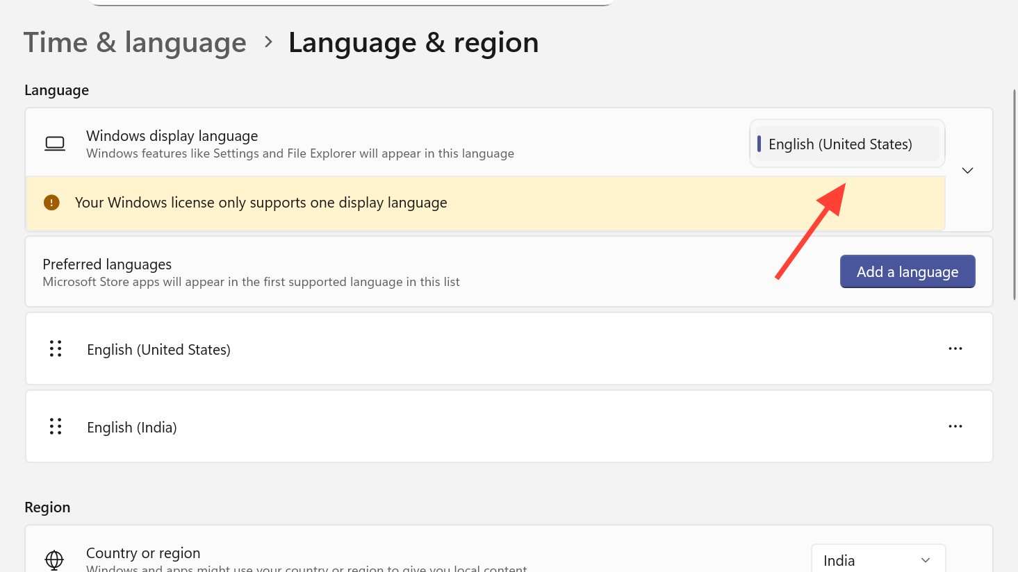 Step 2: Temporarily set your country/region to the United States and the Windows display language to English (United States). Apply changes and sign out if the system asks you to.