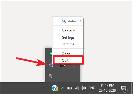 To clear the cache for Microsoft Teams in Windows, first quit the app completely. Go to the system tray and right-click the icon for Microsoft Teams. Then select ‘Quit’ from the menu. Another way to completely quit the app is from the Task Manager.