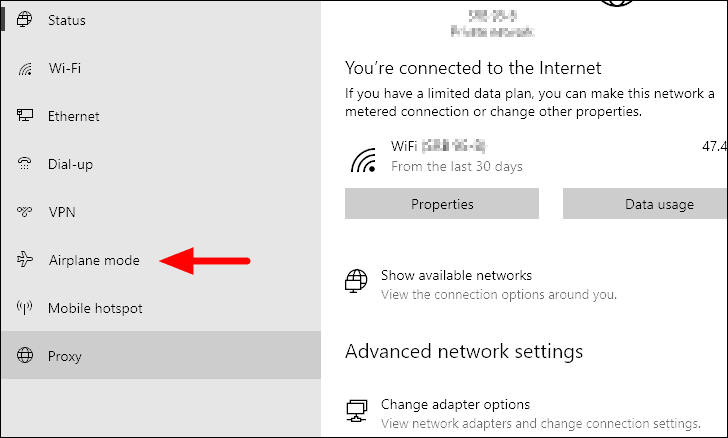 You will now find various tabs on the left related to network settings. Select the ‘Airplane mode’ tab.