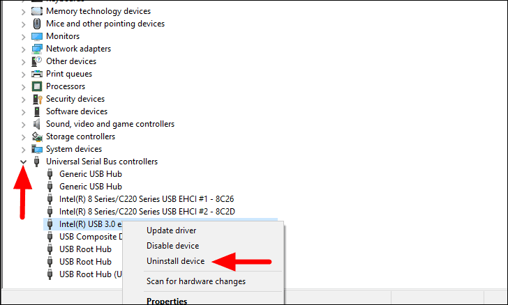 To delete the USB (Universal Serial Bus) controller drivers, click on the arrow before it to expand the various drivers. Right-click on the driver and select ‘Uninstall Device’ from the menu. Again click on the ‘Uninstall’ icon in the warning box that pops up.