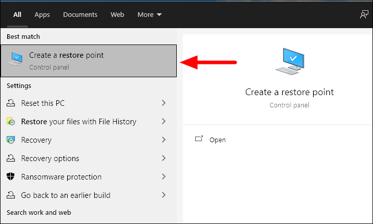 To restore the Windows, search for ‘System Restore’ in the ‘Search Menu’ and then click on ‘Create a restore point’.