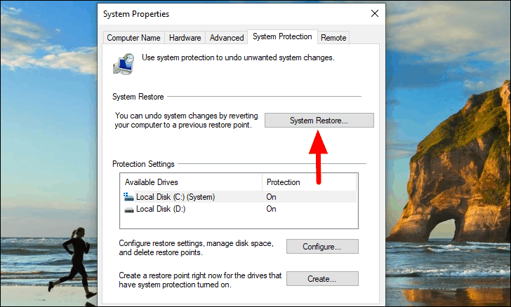 Next, click on ‘System Restore’ in the ‘System Protection’ tab of the ‘System Properties’ box that appears.
