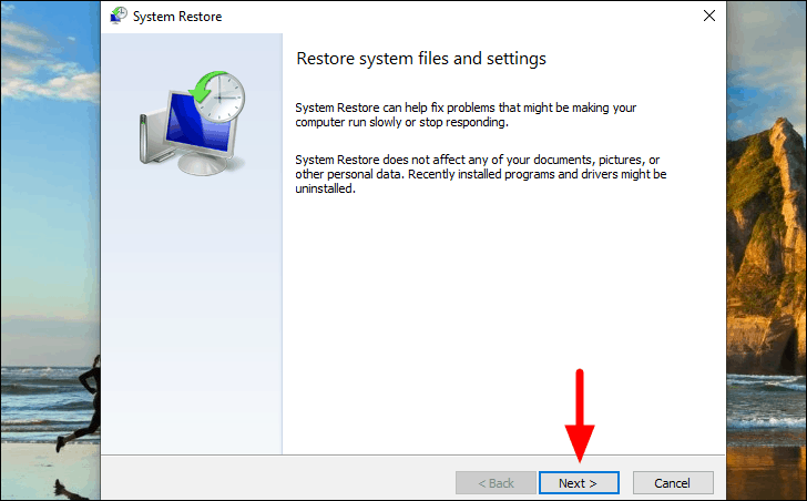 The ‘System Restore’ will now launch. Click on ‘Next’ at the bottom to proceed.