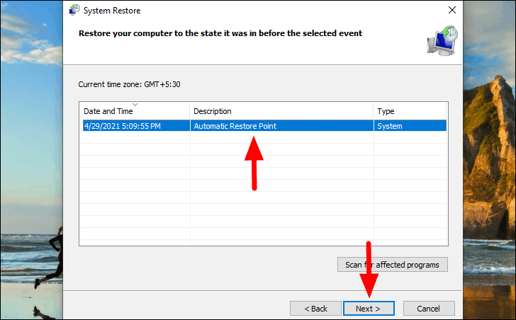 On the next screen, you will find restore points listed. Select the one that’s prior to the time when you first encountered the BCM20702A0 driver error and then click on ‘Next’ at the bottom.