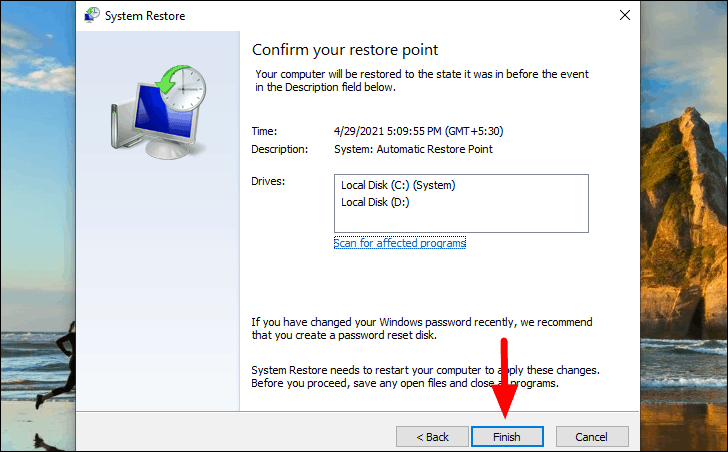 This will be a confirmation page where you can check all the details before making any final changes. Finally, click on ‘Finish’ at the bottom to restore your system.
