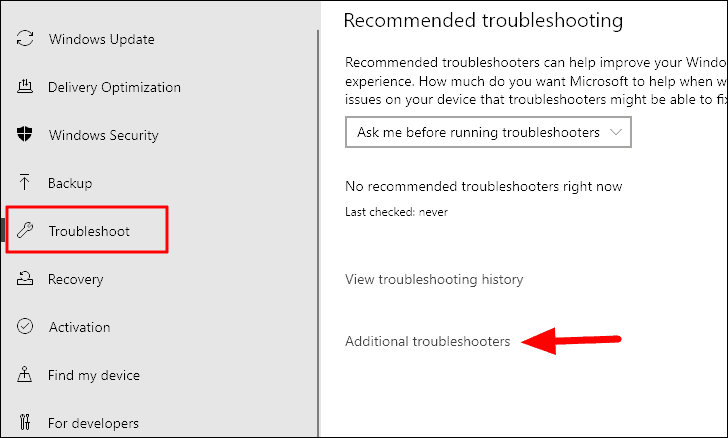 Next, select the ‘Troubleshoot’ tab from the left and then click on ‘Additional troubleshooters’ on the right of the screen.