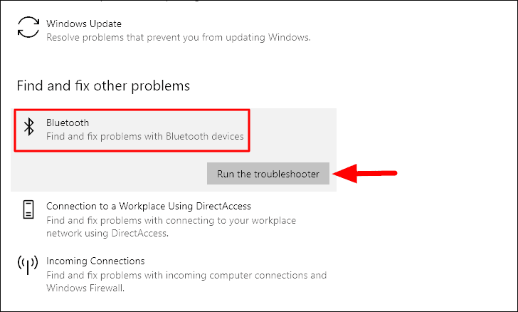 You will now find various troubleshooting options on the screen. Look for ‘Bluetooth’ and click on it. Click on the ‘Run the troubleshooter’ option that appears on the screen.