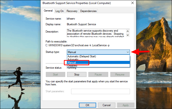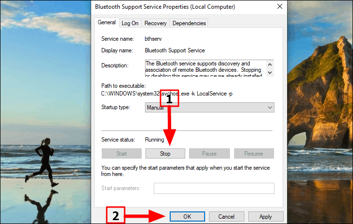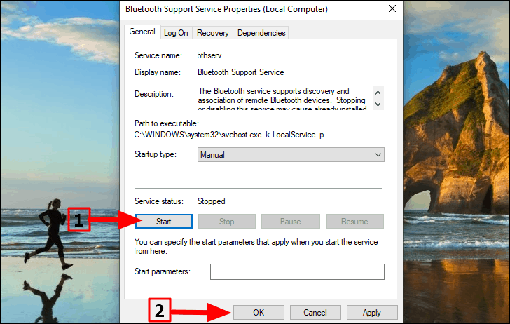 Now, restart your computer and again open the ‘Bluetooth Support Service Properties’ windows, as discussed earlier. Next, click on the ‘Start’ icon under ‘Service status’ to restart the service. Once it’s restarted, click on ‘OK’ at the bottom to save the changes.