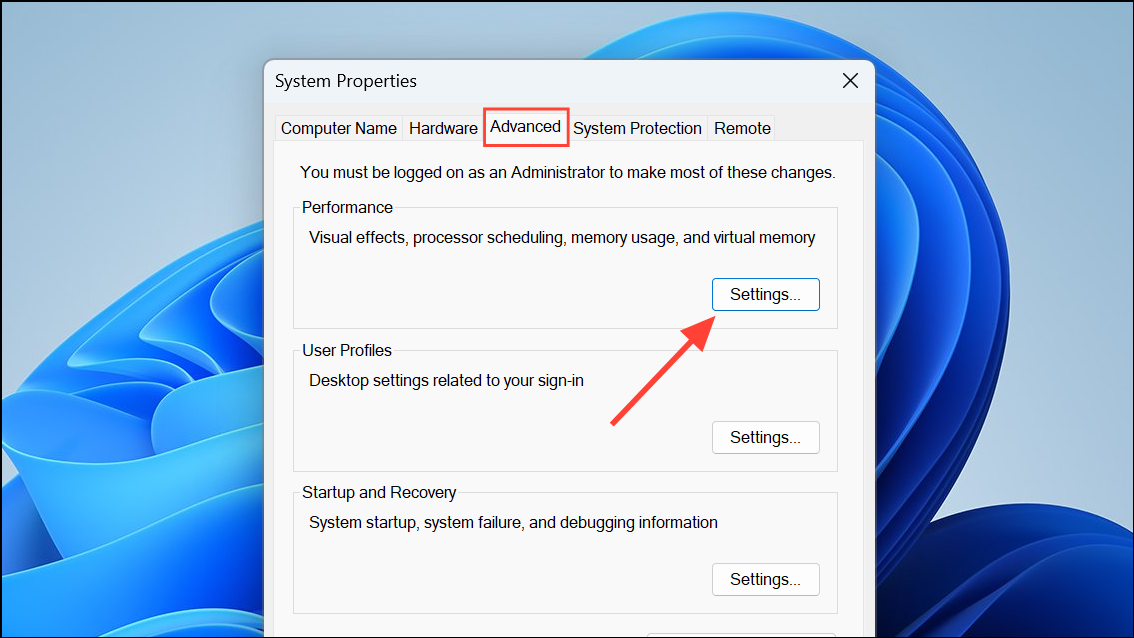 Step 2: On the Advanced tab, click the Settings button in the Performance section.