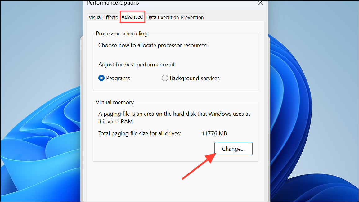 Step 3: Next, go to the Advanced tab at the top and click the Change button in the Virtual Memory section.