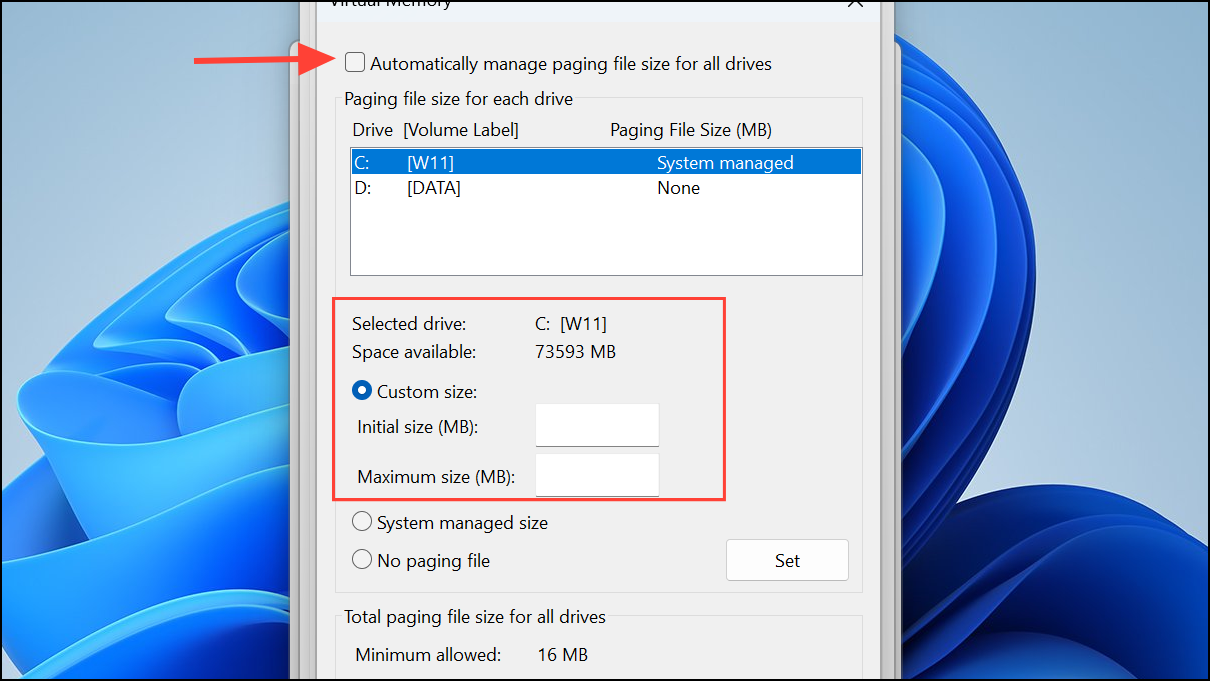 Step 4: Uncheck “Automatically manage paging file size,” and select Custom size below. Then, select your system drive, and set the initial size to 1.5 times your total RAM (in MB) and the maximum size to 3 times your total RAM. Click Set, then OK, and restart your PC.