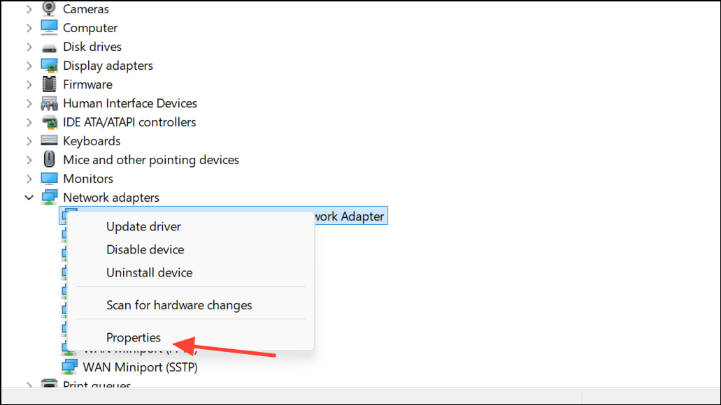 Step 1: In Device Manager, right-click the network adapter and select Properties.