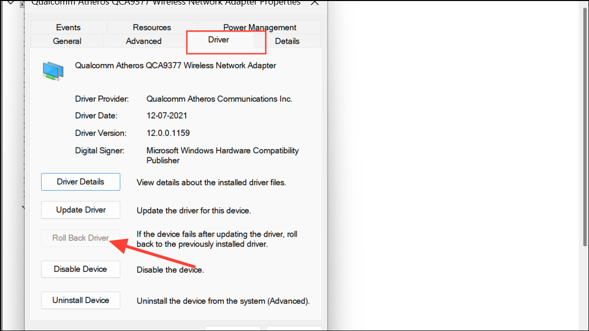 Step 2: Go to the Driver tab and click Roll Back Driver if available. This option reinstalls the previous version that may have worked without causing blue screens.