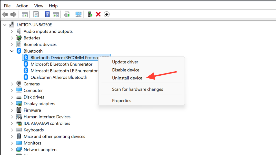 Step 4: Right-click the Bluetooth adapter again and select Uninstall device. In the confirmation dialog, check Delete the driver software for this device if available, then click Uninstall.
