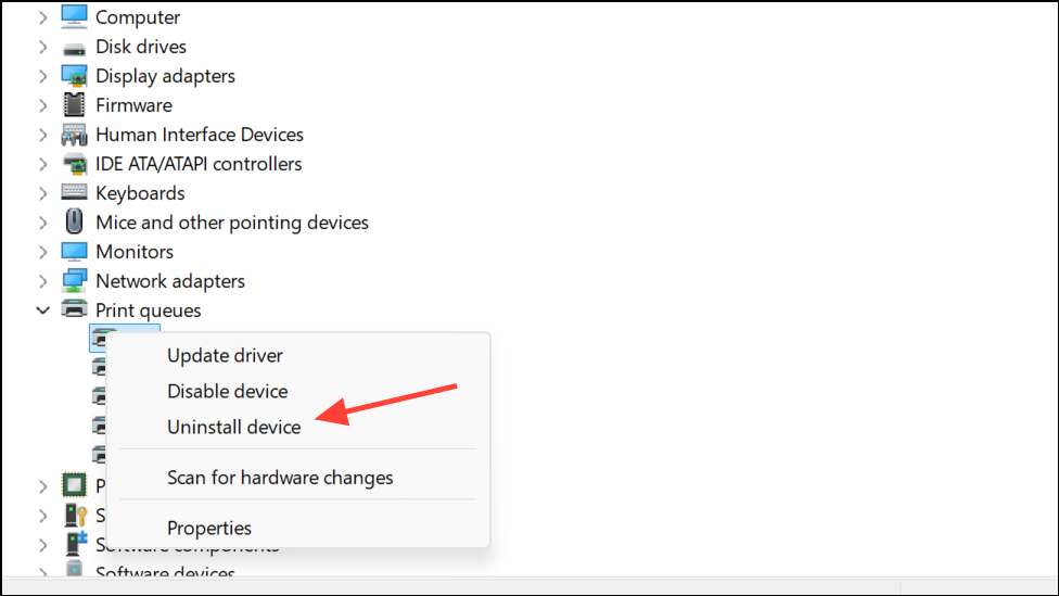 Step 2: Right-click the printer and select Uninstall device. Confirm any prompts to remove the device and its associated drivers.