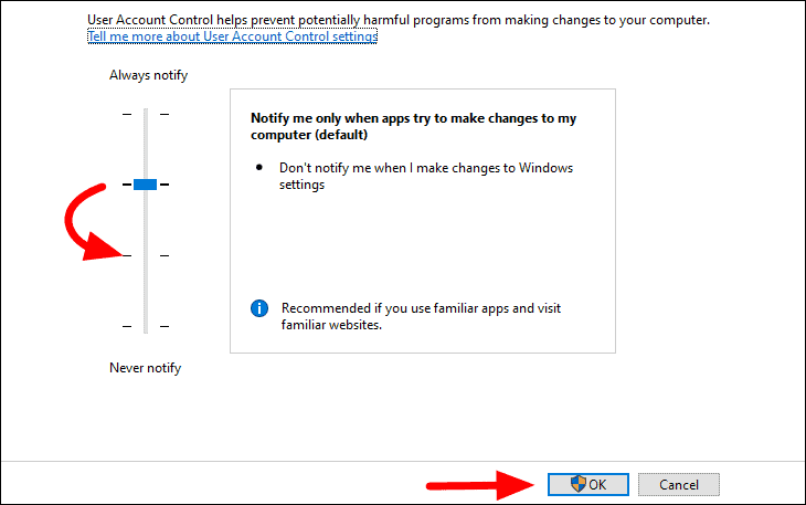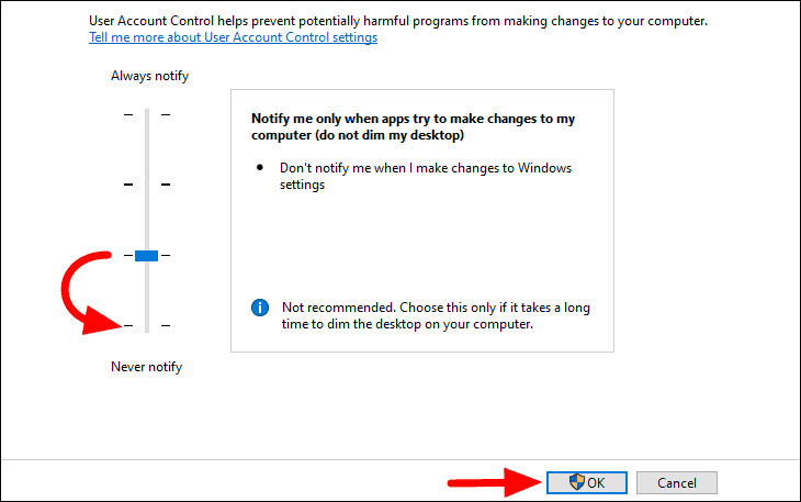 In UAC settings, you will see four levels, the top being ‘Always notify’ and the bottom being ‘Never notify’. The setting is by default set to ‘Notify me only when apps try to make changes to my computer’. Hold and drag the slider to the level under it and then click on ‘OK’ at the bottom to apply the changes. This next one is basically the same setting, with just the difference of not dimming the desktop when the notification/permission box pops up.