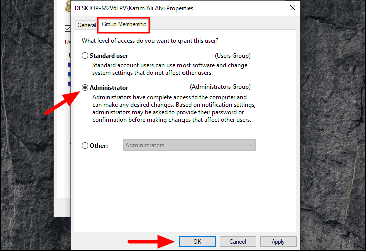 In the ‘Group Membership’ tab, tick the checkbox for ‘Administrator’ to select the option and then click on ‘OK’ at the bottom to apply the changes.
