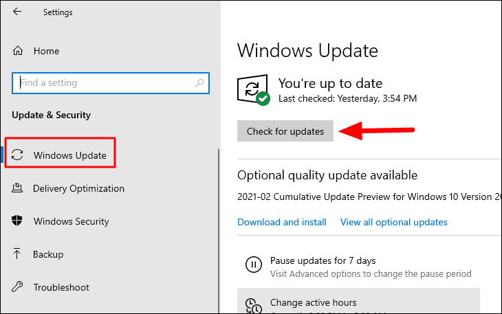 Next, go to the ‘Windows Update’ tab on the left, and then click on ‘Check for updates’. Windows will now look for update, in case, one is available, download and install it to fix the error.