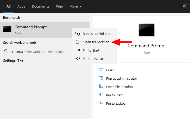 Search for the program you are unable to run as administrator. Right-click on it and then select ‘Open file location’ from the context menu.