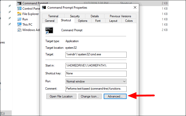 Move to the ‘Shortcut’ tab and then click on ‘Advanced’ at the bottom.