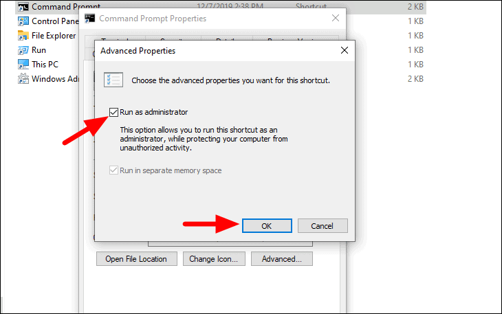 The ‘Advanced Properties’ dialog box will open. Tick the checkbox for ‘Run as administrator’ and click on ‘OK’ at the bottom.