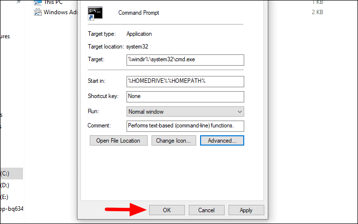 Next, click on ‘OK’ in the ‘Command Prompt Properties’, which is the case in this example.