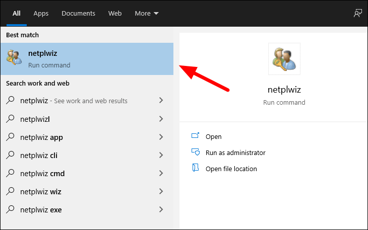 Search for ‘netplwiz’ in the Start Menu, and then click on it to open.