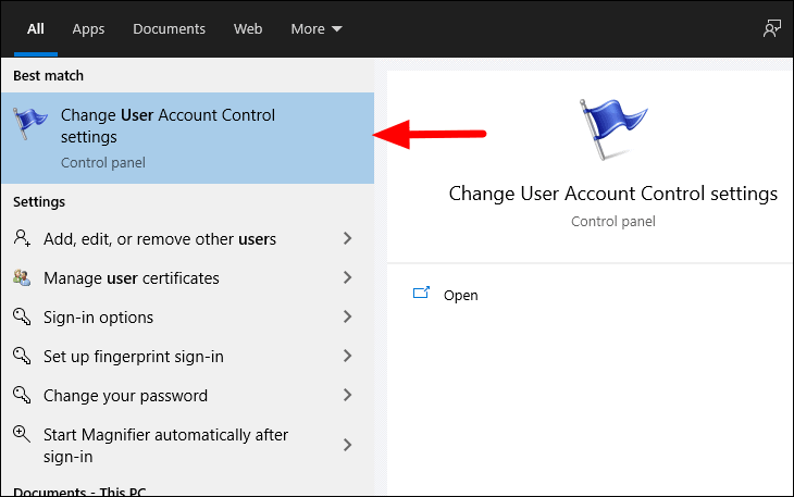 To change the UAC settings, search for ‘Change User Account Control settings’ in the search menu and then open it.