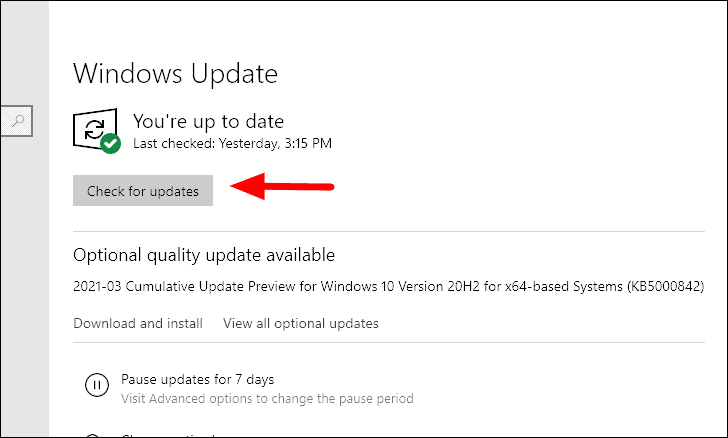 Next, click on the ‘Check for updates’ icon under ‘Windows Update’ to check if there are any available updates. After you click on it, Windows will look up for available updates and then download and install them to your PC. Also, if you see any pending optional quality updates, do download and install them as well.