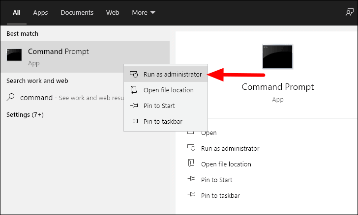 To open the Command Prompt, search for it in the Start Menu, right-click on the option and then select ‘Run as Administrator’ from the menu to open the command prompt.