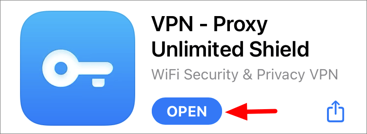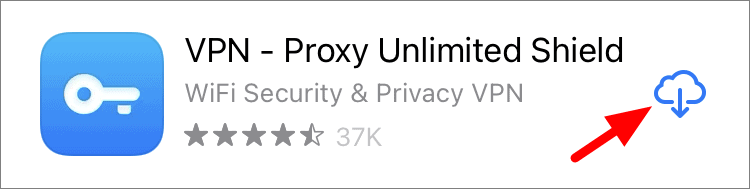 Next, look for ‘VPN – Proxy Unlimited Shield’ in the search results, and then tap on the ‘cloud with a downward-facing arrow’ sign right next to it. If you have never installed the app in the past, tap on the ‘Get’ option positioned similarly.