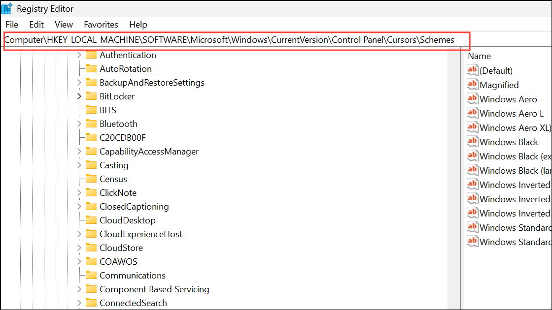 Step 2: Navigate to HKEY_LOCAL_MACHINE\SOFTWARE\Microsoft\Windows\CurrentVersion\Control Panel\Cursors\Schemes. Delete any mouse schemes associated with a corrupted system. If the key does not exist, create a new one and check if the issue resolves.