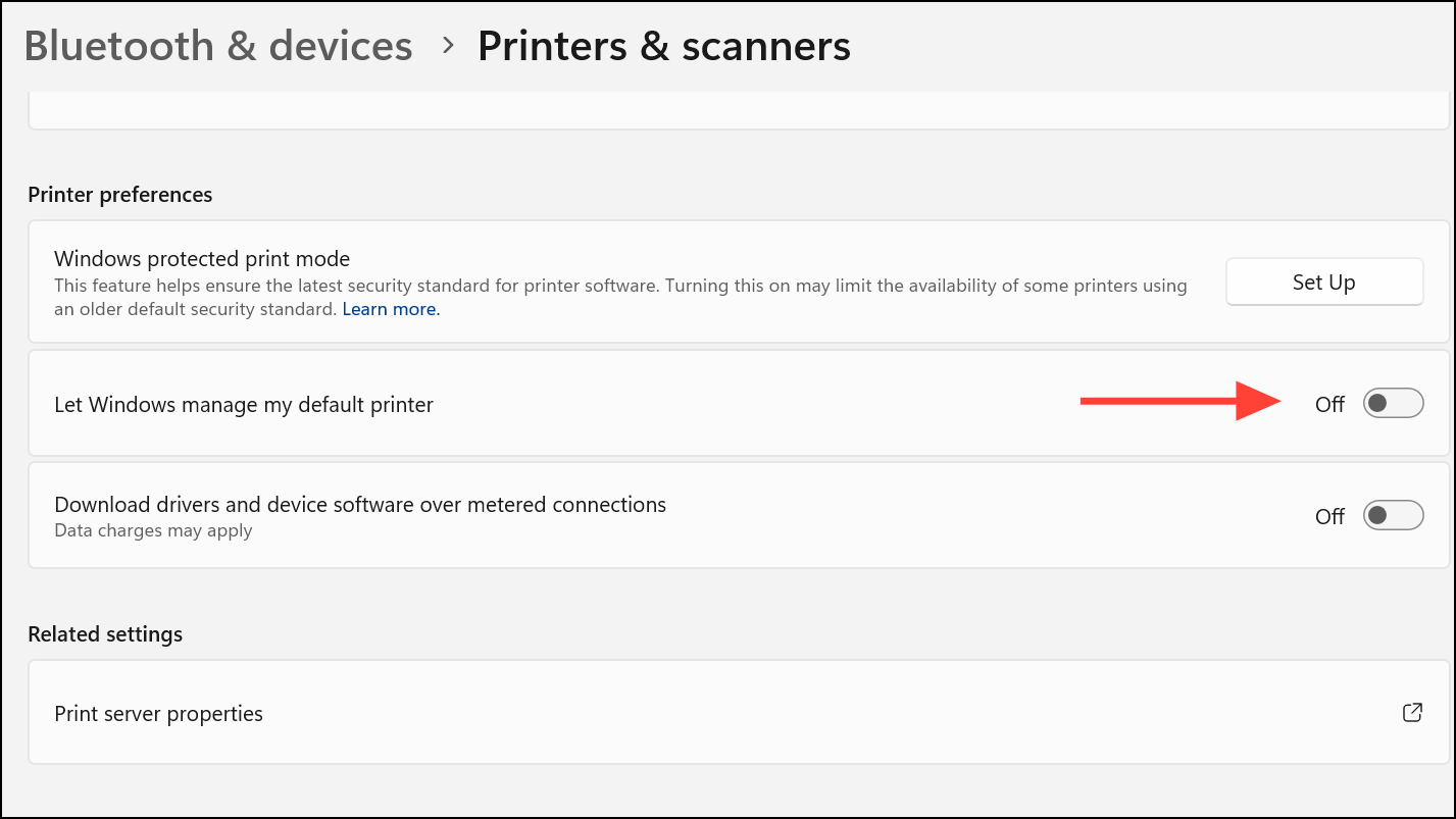 Step 3: Locate the toggle labeled Let Windows manage my default printer. Switch this setting to Off. Turning off this option stops Windows from automatically setting the most recently used printer as the default, giving you full control over which printer remains selected.