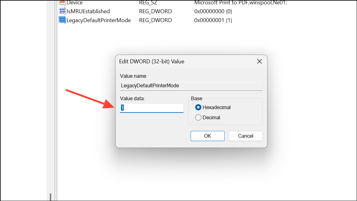 Step 3: On the right panel, find the entry named LegacyDefaultPrinterMode. Double-click it and set its value data to 1. If this entry does not exist, right-click in the right pane, select New > DWORD (32-bit) Value, name it LegacyDefaultPrinterMode, then set the value to 1.
