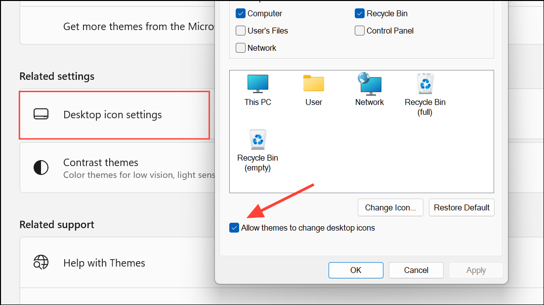 Step 4: Go to Desktop icon settings, uncheck Allow themes to change desktop icons to prevent theme switches from resetting icon positions.