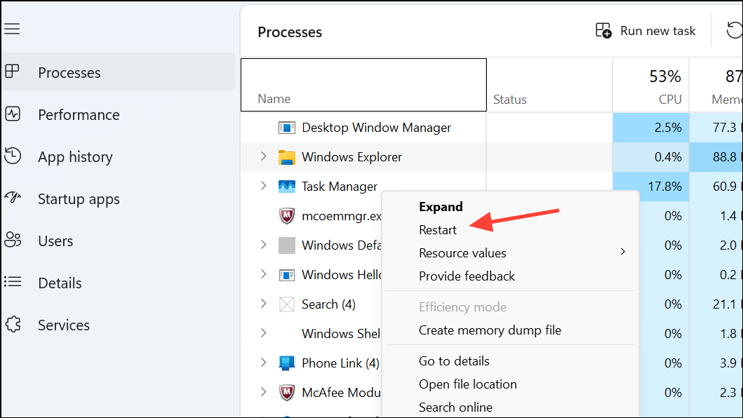 Step 3: Click Restart at the bottom right of the Task Manager window. The screen may briefly flicker as Explorer reloads.