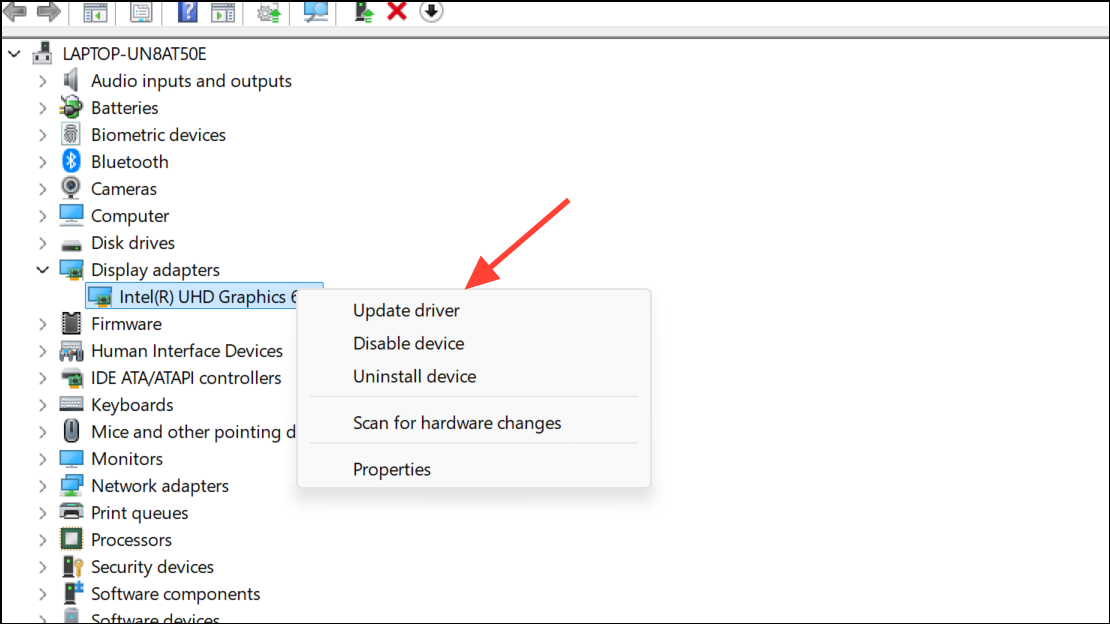 Step 2: Expand Display adapters and right-click your graphics device. Choose Update driver and follow the prompts to search automatically for updated driver software.