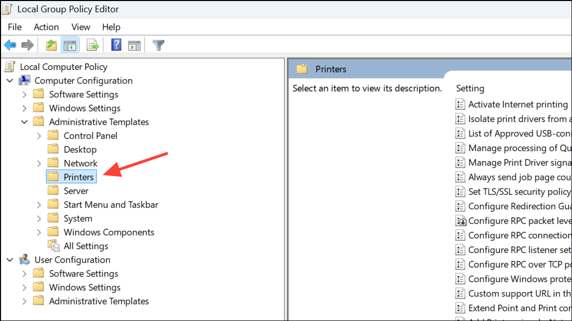 Step 2: In the Group Policy Editor, use the left sidebar to navigate to:Computer Configuration > Administrative Templates > Printers