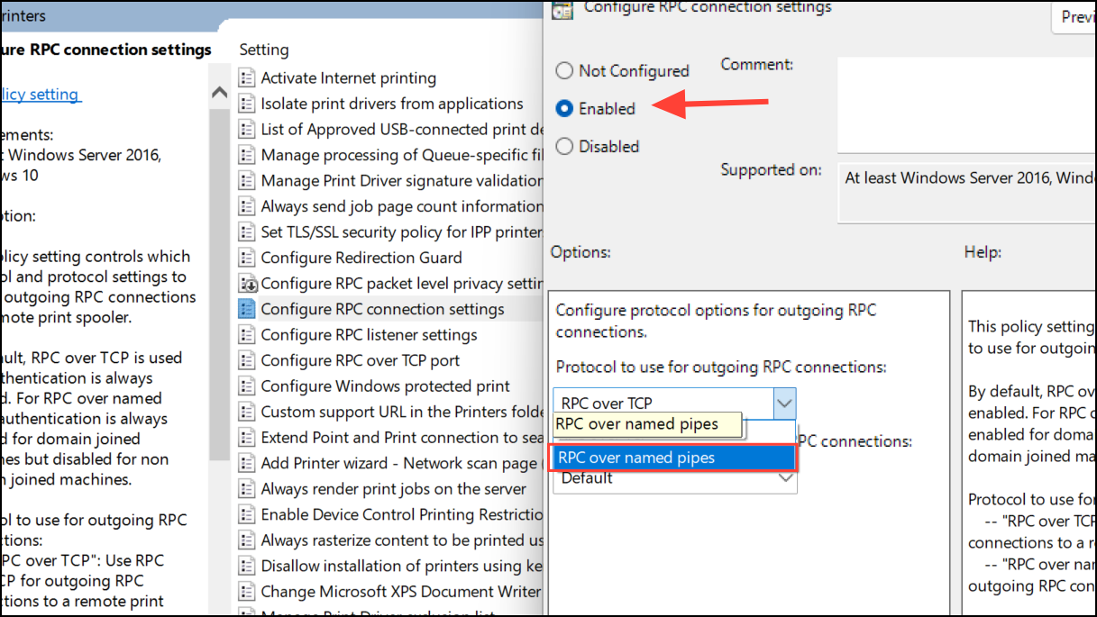 Step 4: Set the policy to Enabled. In the options below, select RPC over named pipes from the dropdown menu. Leave authentication settings at their defaults unless your environment requires specific adjustments.