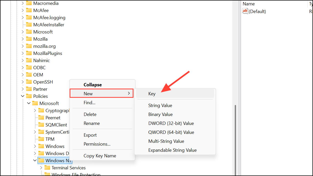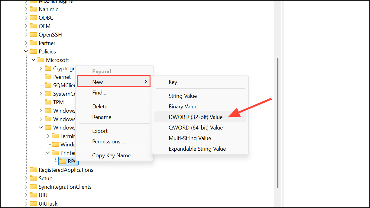 HKEY_LOCAL_MACHINE\SOFTWARE\Policies\Microsoft\Windows NT\Printers\RPCIf the Printers or RPC keys do not exist, right-click to create them as new keys under Windows NT and Printers respectively.