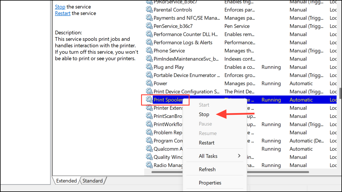 Step 2: Scroll down and locate Print Spooler in the list. Right-click it and choose Stop to halt the service.