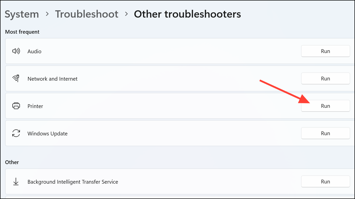 Step 2: Find Printer in the list and click Run next to it.
