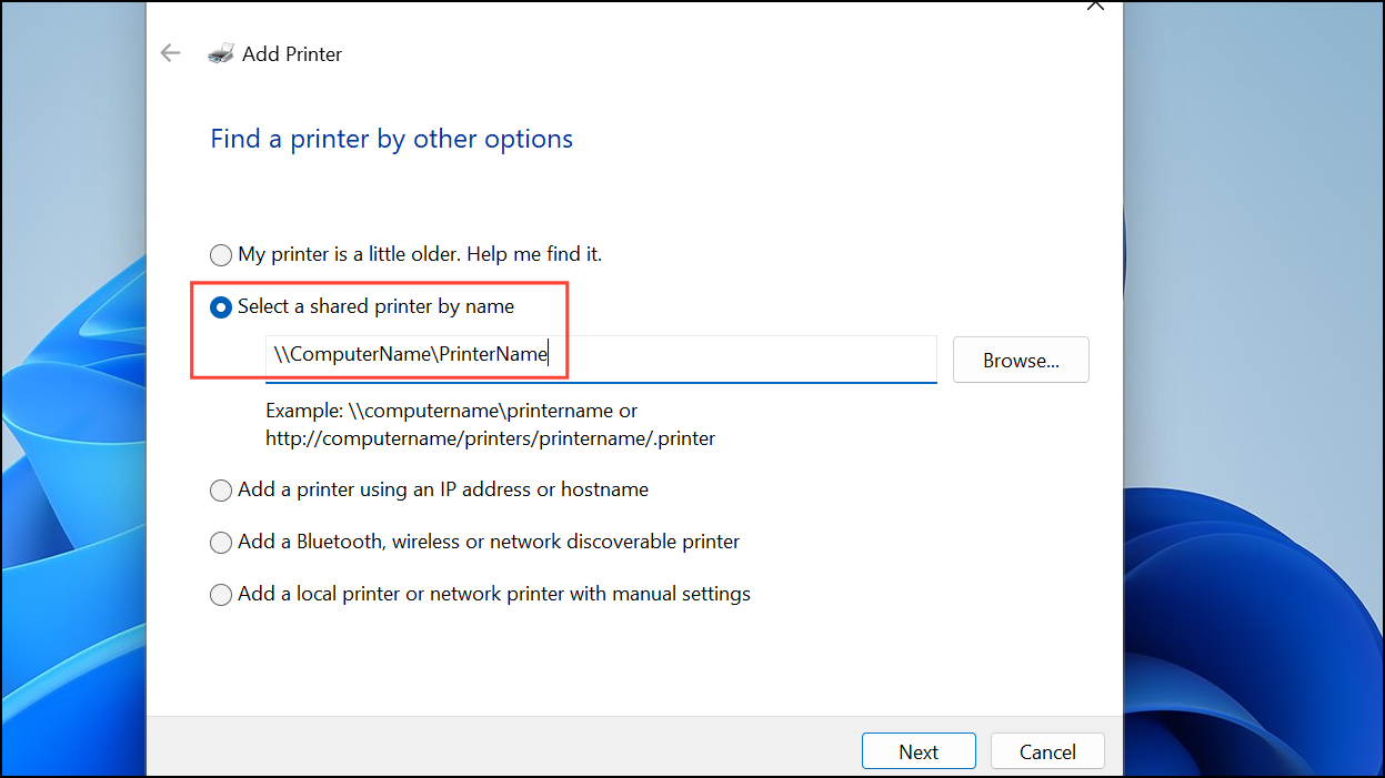 Step 4: Choose Select a shared printer by name. Enter the network path to the shared printer (e.g., \\ComputerName\PrinterName) or browse for it.