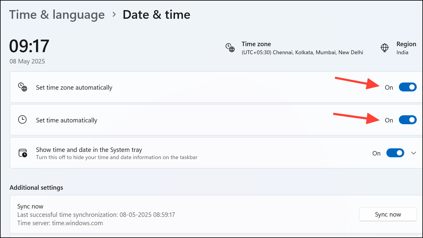 Step 2: Toggle on Set time automatically and Set time zone automatically. These options let Windows sync with Internet time servers, reducing manual errors.