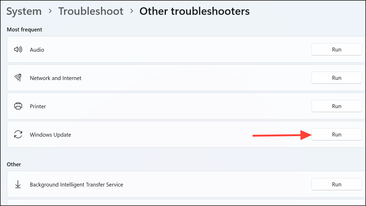 Step 2: Click Other troubleshooters, find Windows Update, and click Run. The tool scans for configuration issues, missing files, or service failures that interrupt updates.
