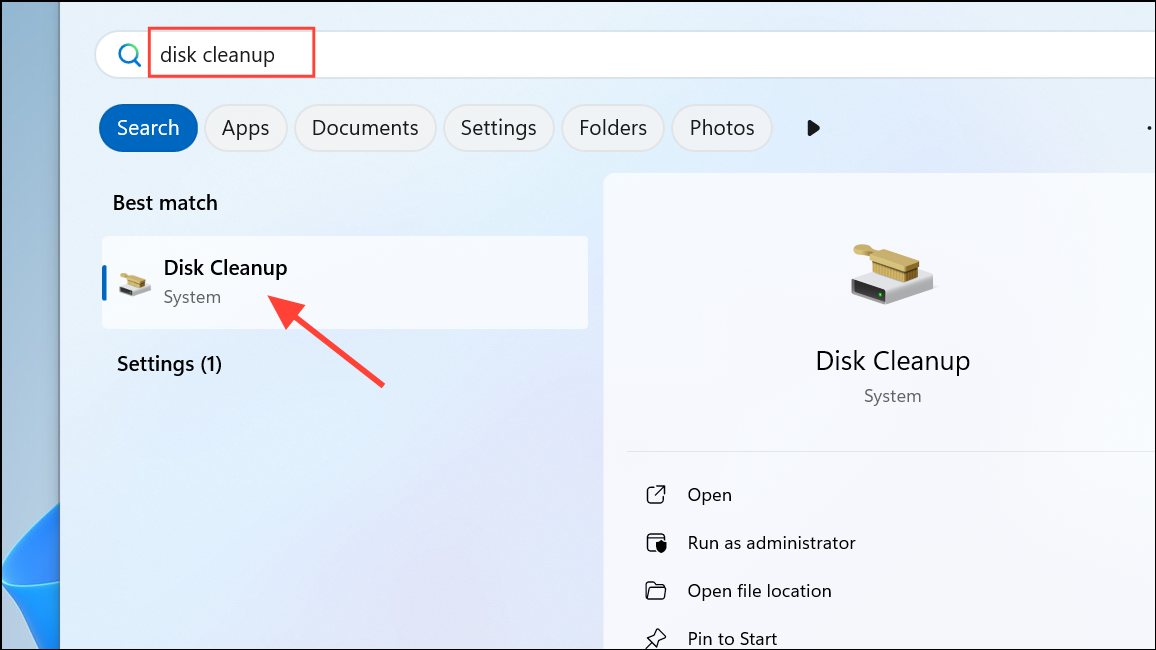 Step 1: Open the search tool and type Disk Cleanup, then select the utility from the results.